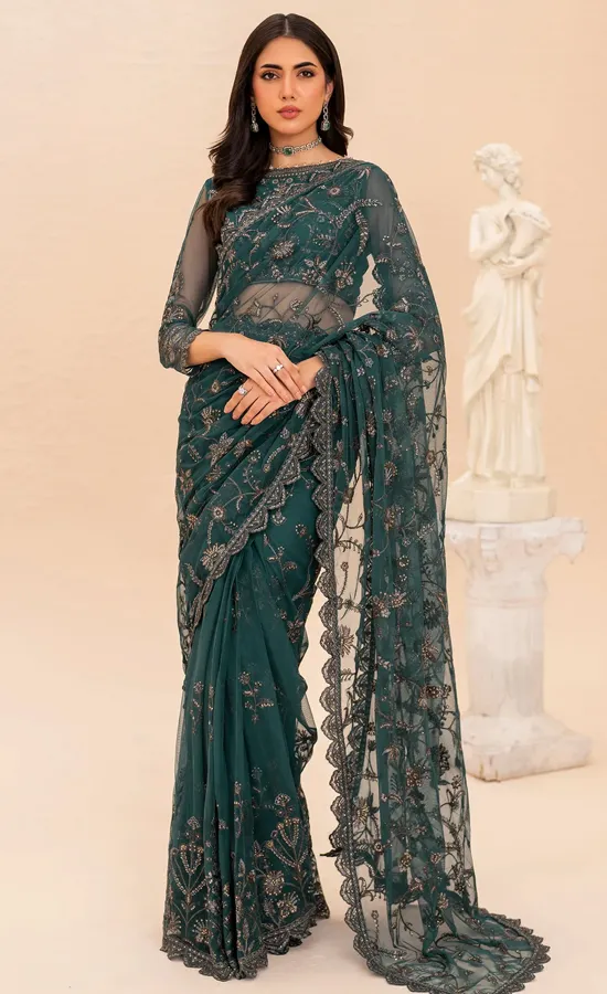 While lehengas and frocks might be the obvious focus for the desi wedding season in the United Kingdom, I can’t stop thinking about emerald green sarees. These festive days can give the dark green saree a chance to shine. For those who love lavishly embellished Pakistani or Indian designer wear, here’s a drool-worthy ready-to-wear ensemble—our signature emerald green saree!