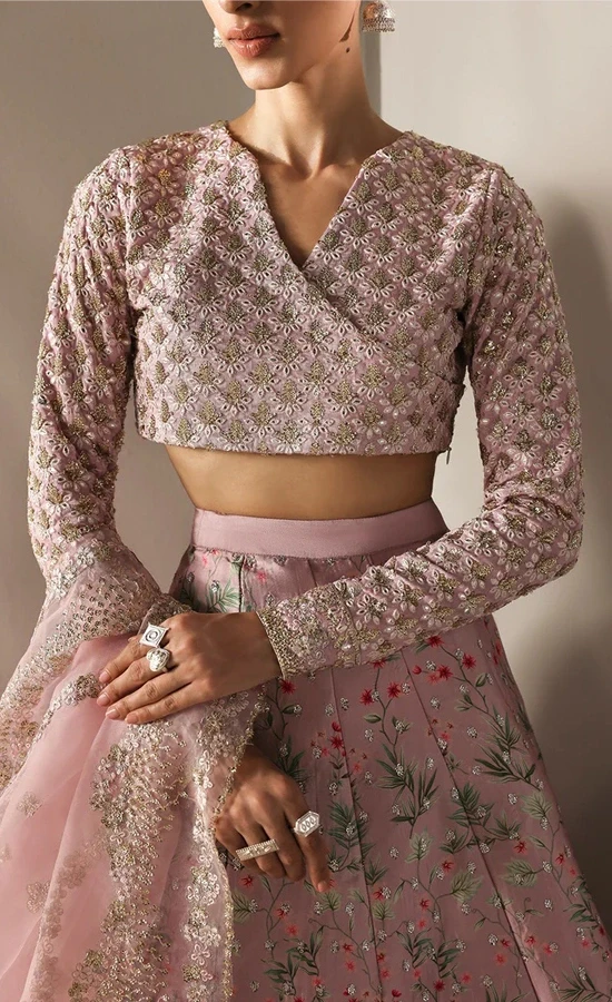 First of all, let’s talk about the fabric; according to our highly professional designers, there can be no better fabric than the net for lilac wedding guest lehenga choli. We have chosen the finest quality net, on which premium sequins and threadwork have been done with such sophistication that they mesmerise the viewer. Then, we chose the highest quality raw silk for the lining (the underneath fabric). We have never compromised on the fabric of the lining and main fabric. Because for us, there is nothing better than quality. Our artisans have used breathtakingly elegant luxury lace made of pearls on the blouse, sleeves, and lehenga border to embellish this iconic lehenga choli further, which shines like stars during the night function.