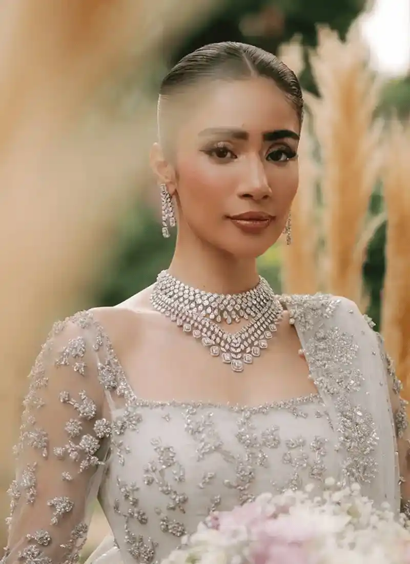 A radiating silver hand embroidery all over the top with sequin work, pearls, and sumptuous mirrorwork can gather you compliments instantly. The Atlas inner also features an elegant embroidered patch on the borders. What for ultra-modern brides? Yes, the back is open, the sleeves are see-through, and the neckline is wide and deep, making this timeless piece the most trustworthy piece to buy. The highest quality net has been used in this New Ivory Bridal Peshwas for the top and veil, and the veil is longer than a normal dupatta. Plus, the veil also features Mukesh’s look and feel with all four sides and heavy embroidery borders.