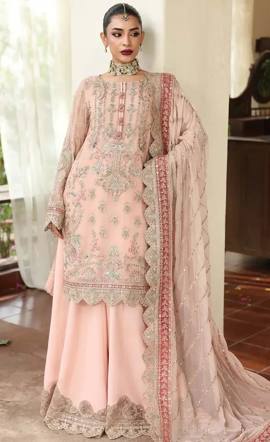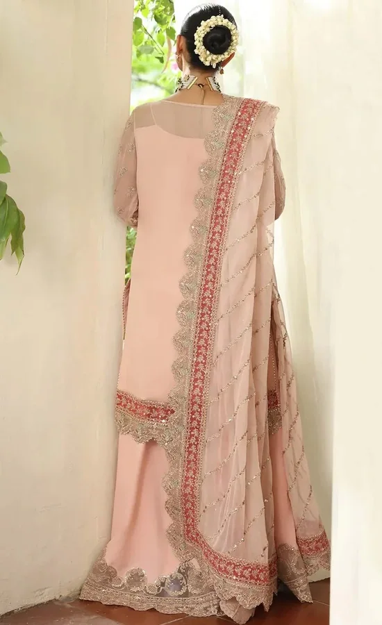 The Peach Colour Sharara Suit is absolutely stunning! The hand embroidery is gorgeous.