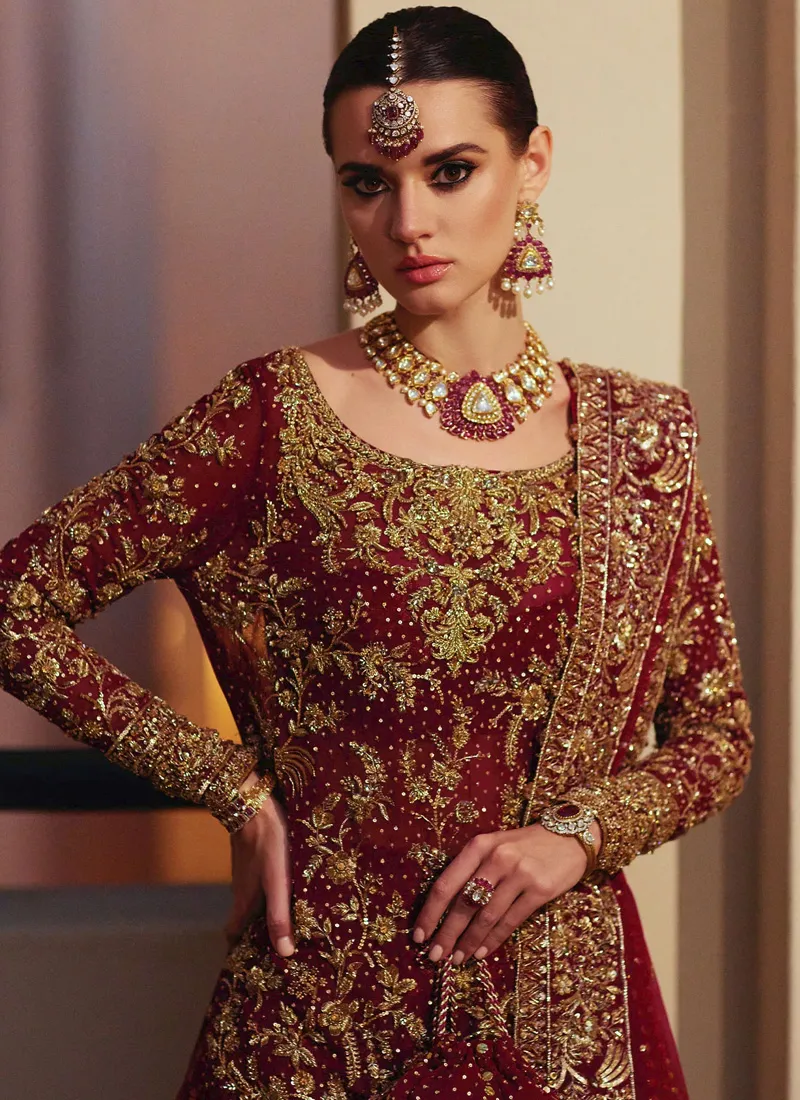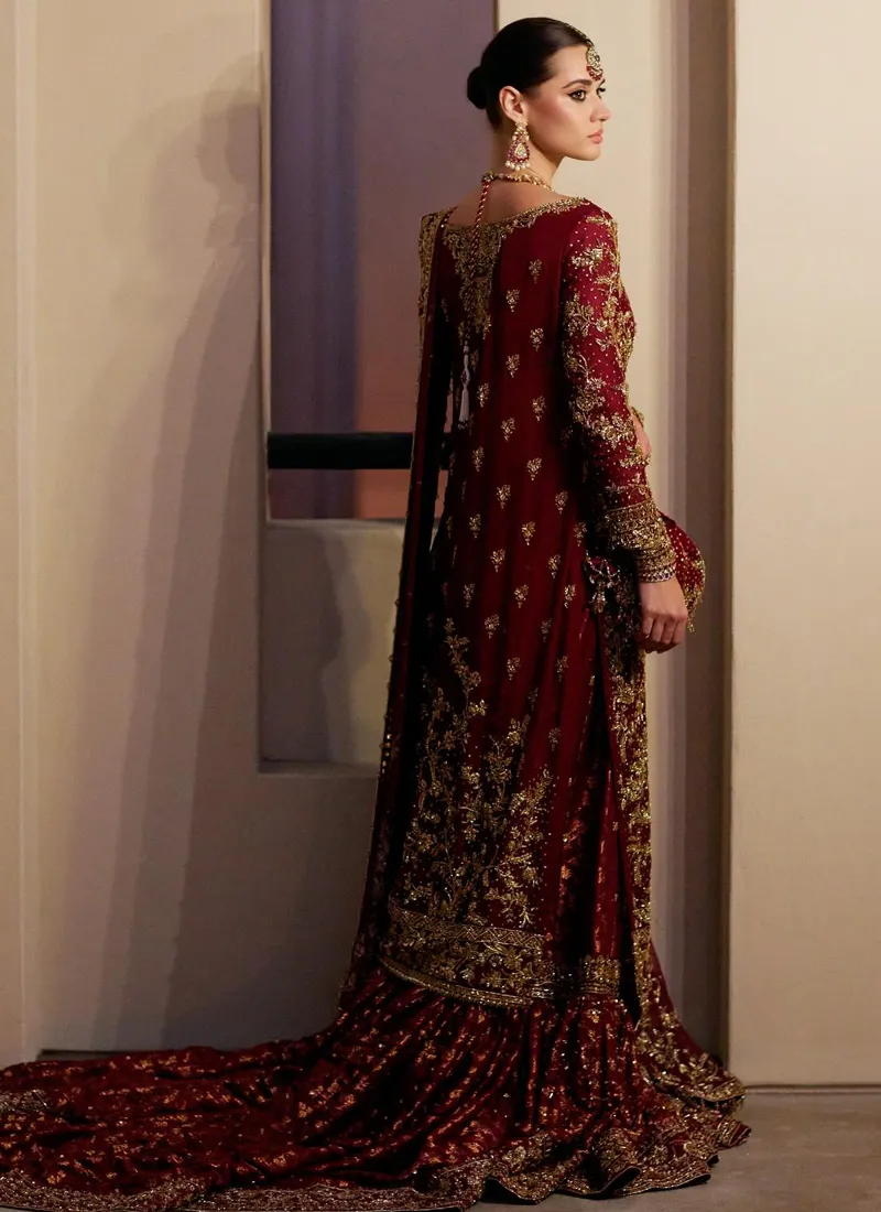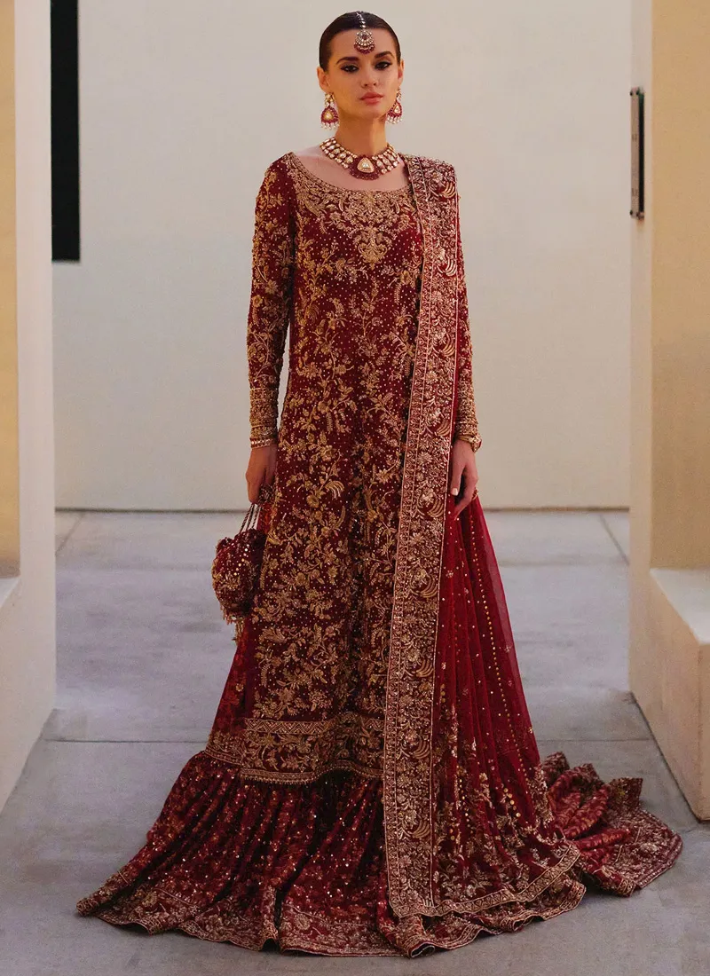 Features of Deep Red Bridal Gharara Dress:
