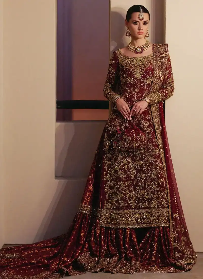 There are some desi women trends that come in each season, yet there are some unique looks that are just classic and evergreen, and of course, Gharara is one of them. The gharara trend continues from previous wedding seasons with modern twists, new cutwork styles, and gorgeous looks. In fact, a picture-perfect bridal gharara never loses its charm and importance in weddings. A wide-leg gharara is a wardrobe staple for every desi woman. Check out this ethereal Deep Red Bridal Gharara Dress, which was released for chic and contemporary brides.