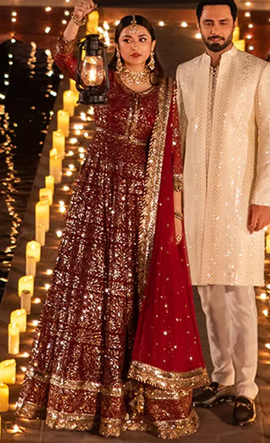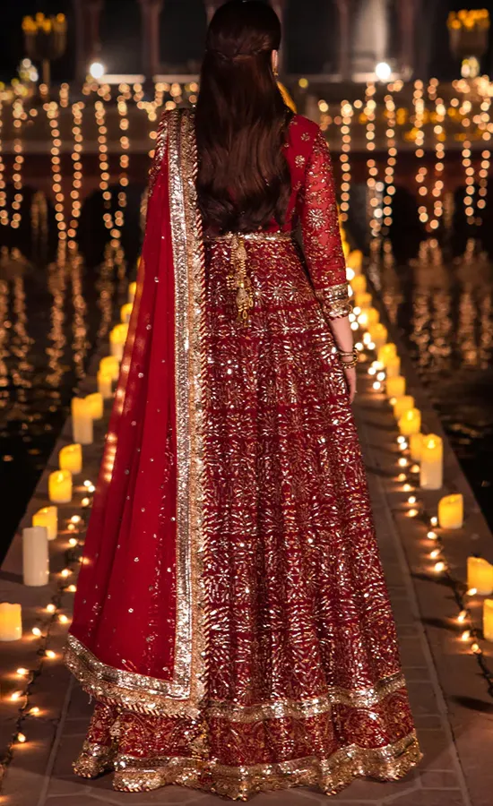 The colour of this dress plays a significant role in Pakistani and Indian culture, as deep candy red is a timeless favourite for brides and wedding guests. The designer has created stunning golden embroidery on the deep red base, capturing the viewer’s attention at first glance. The combination of red and gold is always a popular choice in women’s attire.