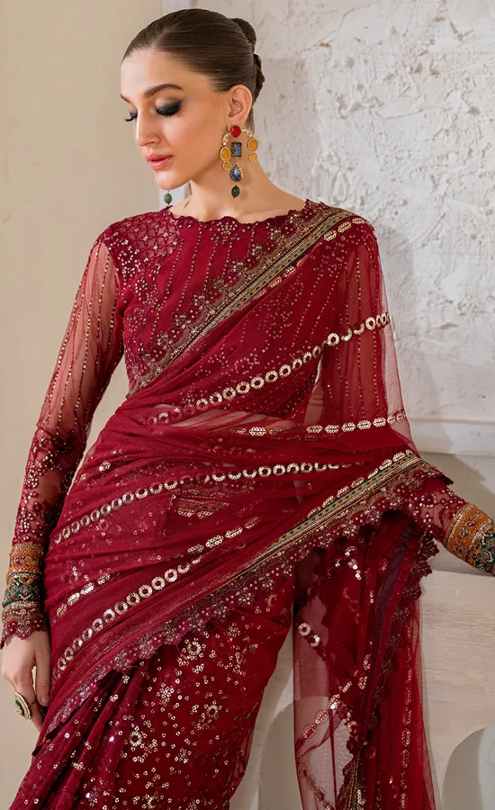 Here is only one piece from our blockbuster wedding guest collection—a breathtakingly gorgeous, fully stitched maroon saree.