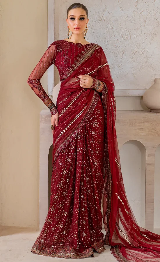 The Maroon Saree is absolutely stunning! The embroidery and 3D flowers are so beautiful. Highly recommend Pakistani Bridal Dresses!