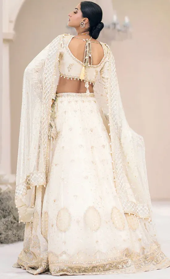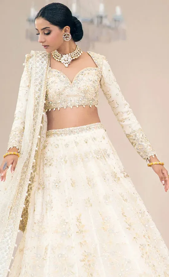 Let’s talk about the dreamy white lehenga for wedding festivities. Lehenga has a unique ability; it suits almost every body type. This white lehenga for women has been lavishly decorated with the same exquisite embroidery techniques enriched by comprehensive crystal work. The canvas of sheer net is enriched by traditional motifs and the luxuriance of off-white and silver, making it a dynamic yet elegant wedding lehenga in white.